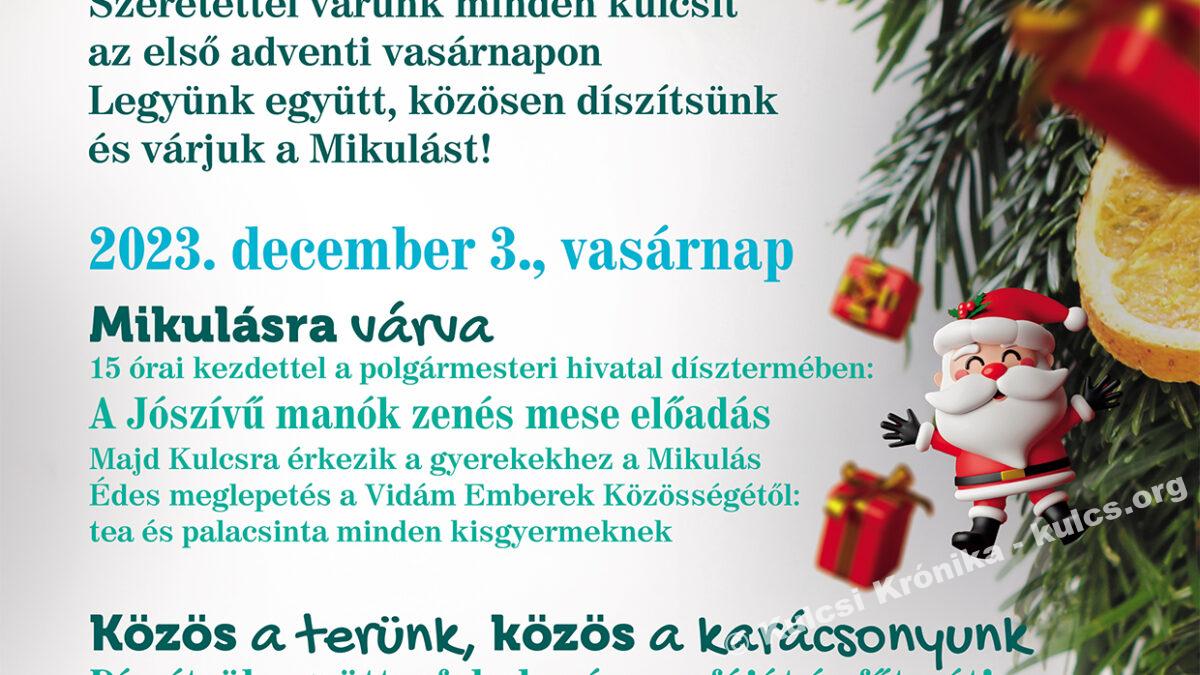 December 3 -án Kulcsra érkeznek a Mikulás manói, akiket Erik Farkas színművész és Polgár Lilla színésznő személyesítenek meg. A nagyszakállú Mikulás is velük érkezik majd, zsákjában meglepetésekkel. Tehát nagyszerű műsor ígérkezik a kicsiknek, amíg a felnőttek a téren szorgoskodhatnak.